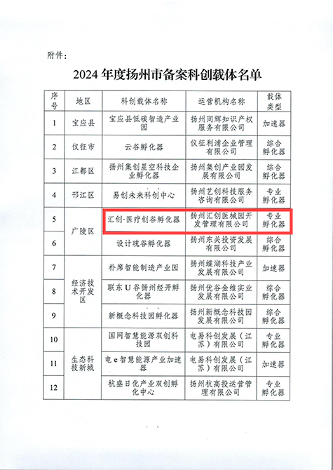 集團旗下匯創·醫療創谷產業園成功獲批揚州市科技企業孵化器 |